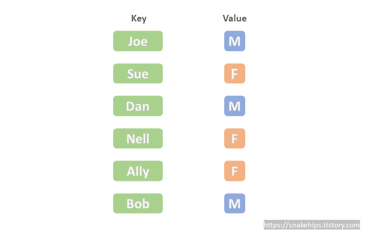총 6명의 사람들에 대해 이름을 Key로, 성별을 Value로 저장하는 경우에 대해서 알아보자.
