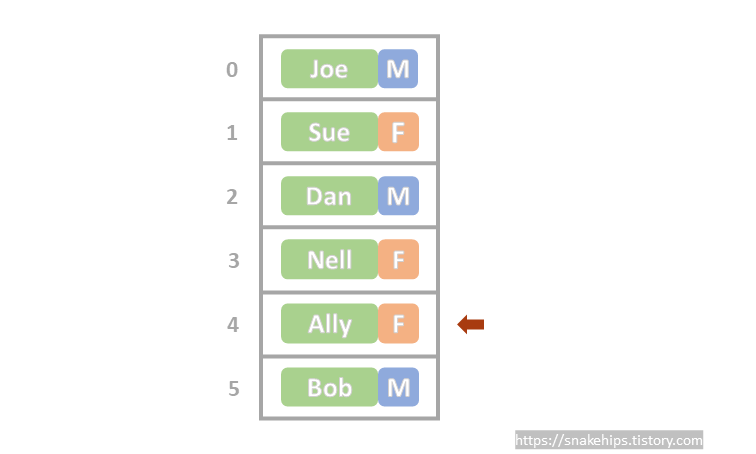이 데이터들을 단순 '배열'에 저장했을 때 Ally의 성별을 알고 싶다고 가정해보자.