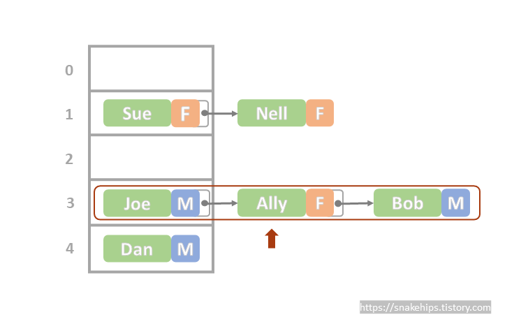 하지만 3번에 저장된 데이터의 키는 "Joe"이지 "Ally"가 아니다.