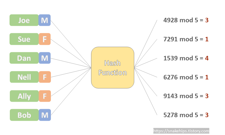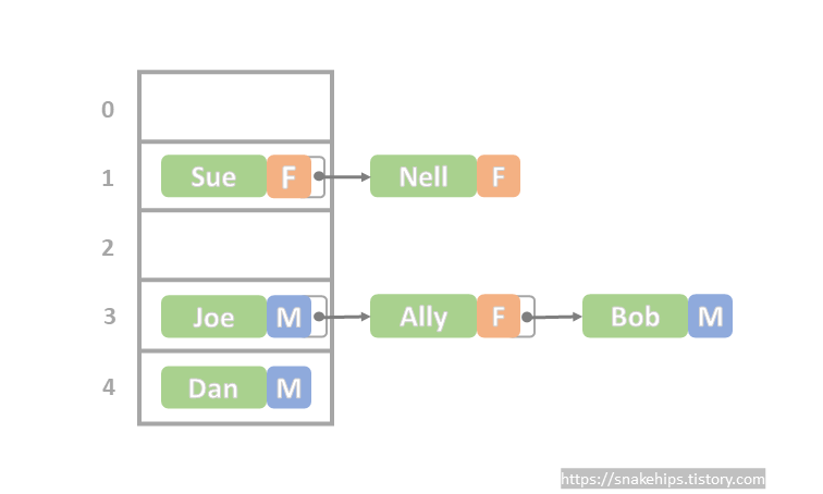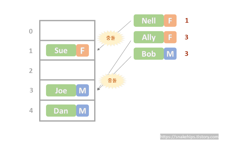 - 배열의 인덱스 값이 mod 연산 결과값과 일치하는 곳에 Joe의 데이터를 저장한다. ☜ array[3]에 Joe 데이터 저장