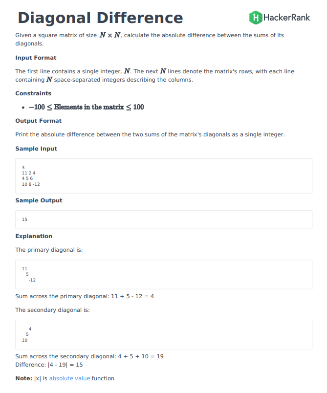 https://www.hackerrank.com/challenges/diagonal-difference/problem