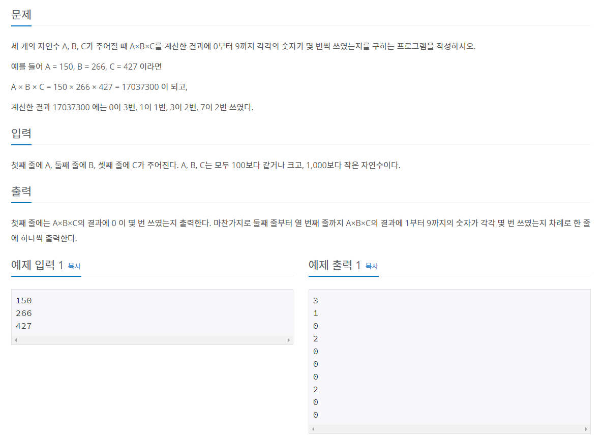 0~9개가 각각 몇 개인지 저장할 배열 count를 만든다. (배열값들 0으로 초기화)