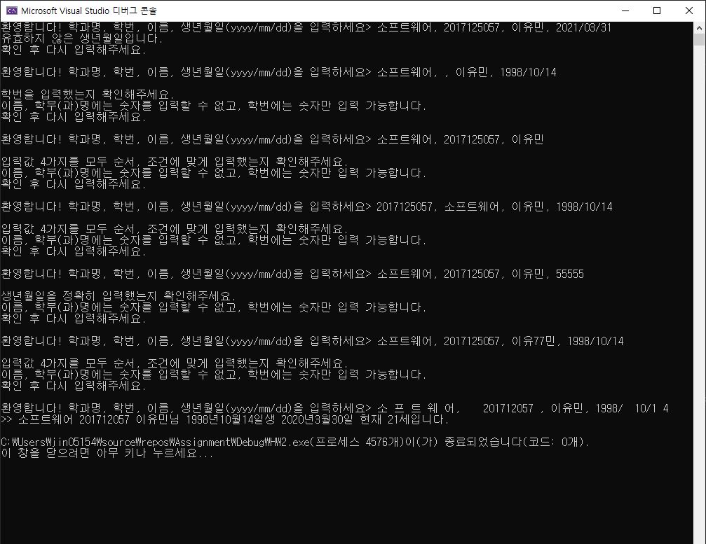 1주차에 작성한 학과명, 학번, 이름, 생년월일, 나이, 현재날짜를 출력하는 C++ 프로그램을 수정하여 다음 기능을 포함하도록 작성하라.