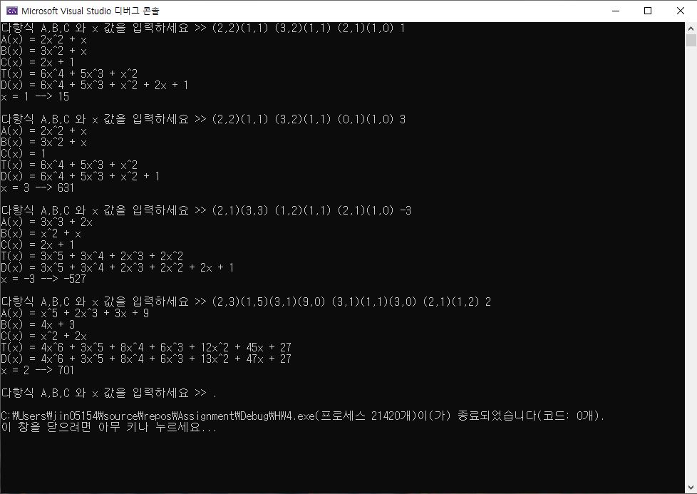 Polynomial a, b, c, d, t; // a,b,c 다항식 읽고 생성, t=a*b, d=t+c