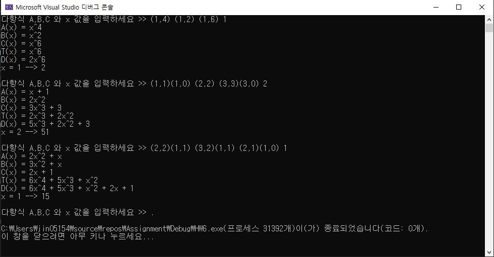 Polynomial a, b, c, d, t; // a,b,c 다항식 읽고 생성, t=a*b, d=t+c