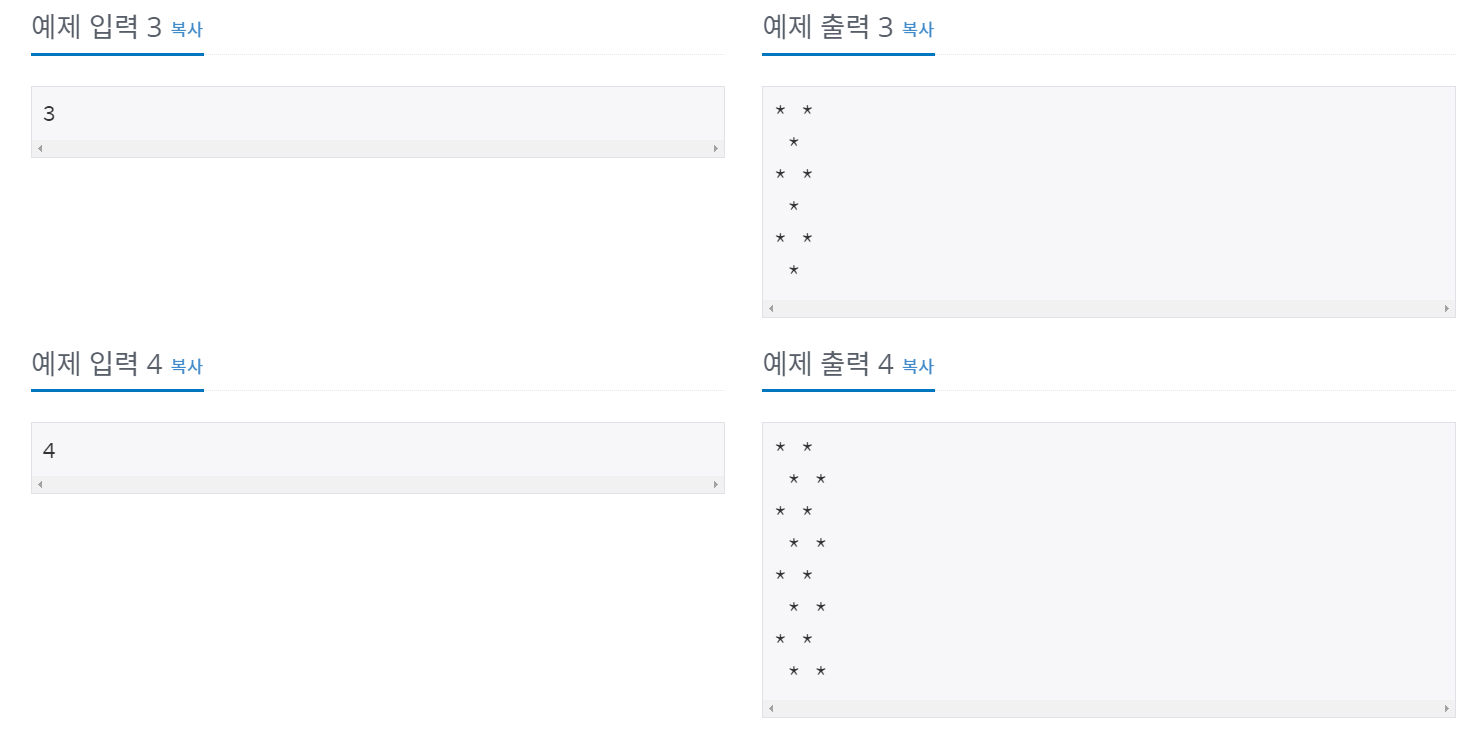 짝수일 때는 첫번째 줄에 N/2개, 그 다음 줄에 한 칸 띄고 N/2개를 출력하는 게 한 세트이다.