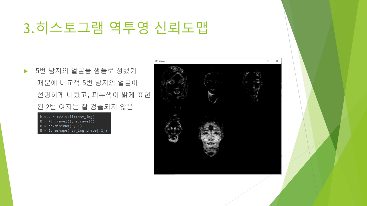 3. *적절한* 크기의 사람 얼굴이 포함된 입력영상에 대하여 모델 히스토그램을 이용하여 역투영 과정을 실행합니다.