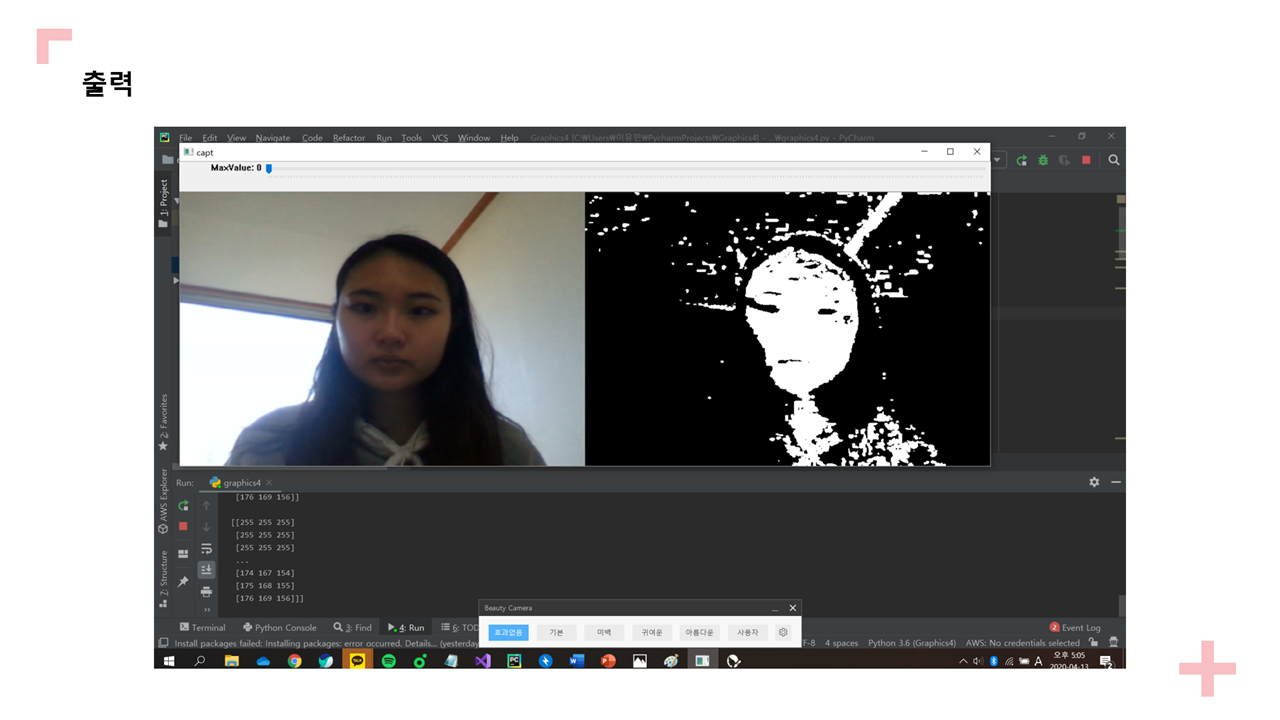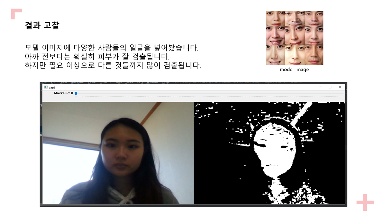 A. 03주차의 얼굴 검출 프로그램을 활용하여 웹캠으로 live feed 받는 영상에서 사람의 얼굴 또는 피부만을 검출한 영상을 연속적으로 보여준다.