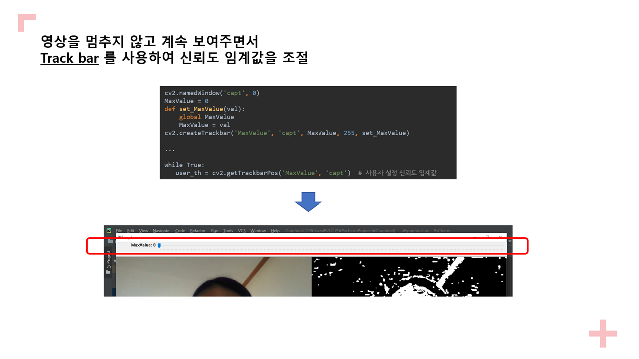 user_th = cv2.getTrackbarPos('MaxValue', 'capt') # 사용자 설정 신뢰도 임계값