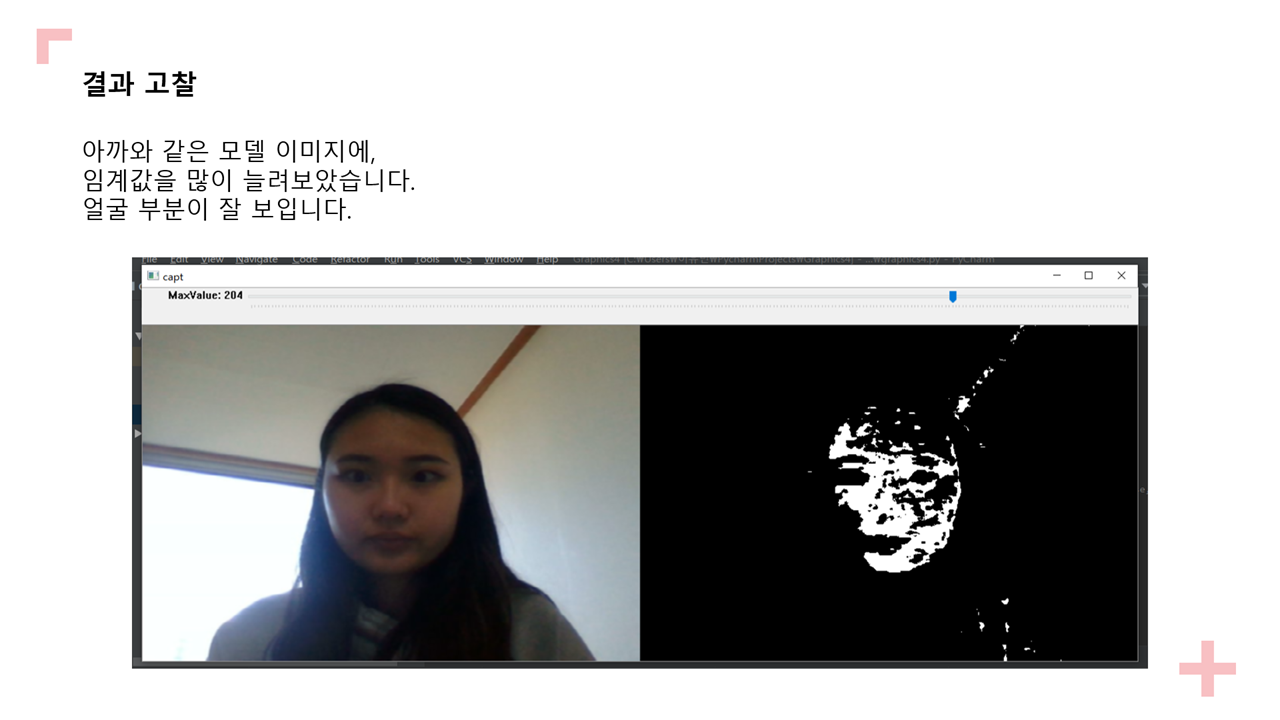 | 웹캠으로 부터의 live feed 를 연속적으로 디스플레이 함 | 왼쪽 영상에 대한 얼굴 검출 결과 : 얼굴, 피부 영역만 원래 색으로 표시하고 나머지 영역은 검정색으로 처리 |