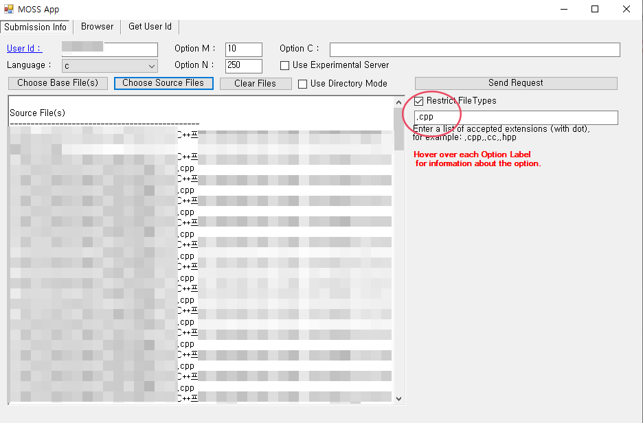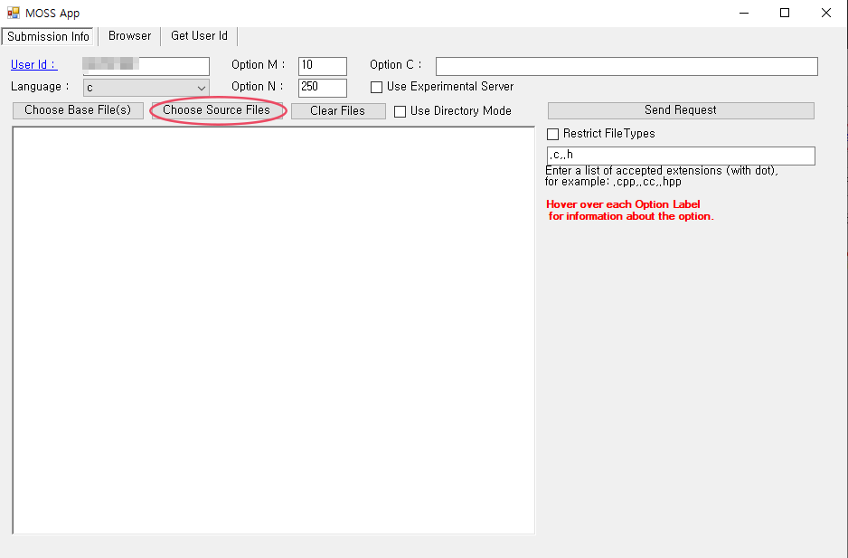 맨 위에 user id를 입력하고, Choose Source Files에서 유사도를 검사하고자 하는 소스코드를 모아놓은 파일을 선택해준다.