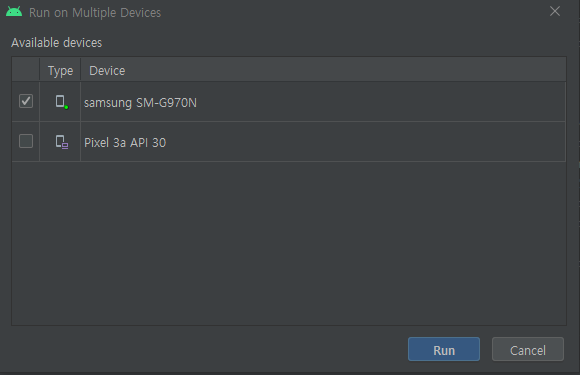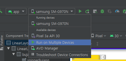 우측 상단에서 device 설정해주는 곳에서 Run on Multiple Devices를 클릭해주면