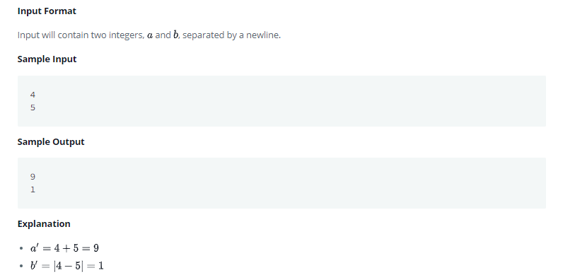 printf("%d\n%d", a, b);