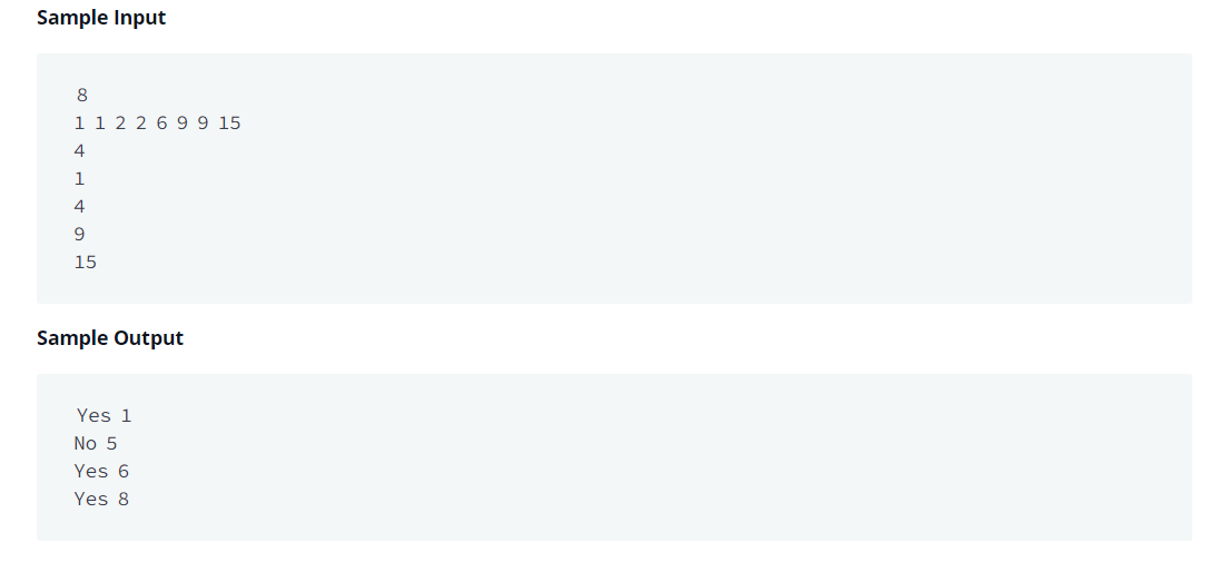 if (y == arr[low - iter]) cout << "Yes " << (low - iter + 1) << endl;